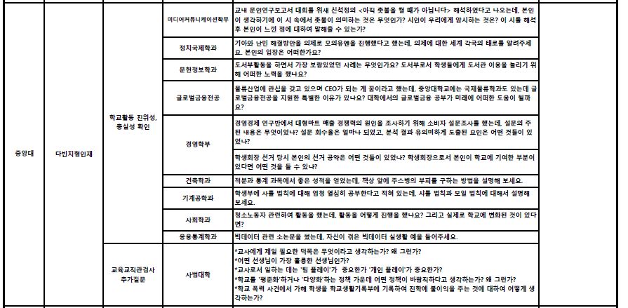| |  | | | ▲ 출처=2017 수시 백전불태 확정편 | ■ 중앙대 다빈치형인재전형 면접 문제 미디어커뮤니케이션학부: 교내 문인연구보고서 대회를 위해 신석정의 <아직 촛불을 켤 때가 아닙니다>를 해석하였다고 나오는데, 본인이 생각하기에 이 시 속에서 촛불이 의미하는 것은 무엇인가? 시인이 우리에게 암시하는 것은? 이 시를 해석 후 본인이 느낀 점에 대하여 말해줄 수 있는가? 정치국제학과: 기아와 난민 해결방안을 의제로 모의 유엔을 진행했다고 했는데, 의제에 대한 세계 각국의 입장을 알려 주세요. 본인의 입장은 어떠한가요? 문헌정보학과: 도서부활동을 하면서 가장 보람 있었던 사례는 무엇인가요? 도서부로서 학생들에게 도서관 이용을 늘리기 위해 어떠한 노력을 했나요? 글로벌금융전공: 물류산업에 관심을 갖고 있으며 CEO가 되는 게 꿈이라고 했는데, 중앙대학교에는 국제물류학과도 있는데 글로벌금융전공을 지원한 특별한 이유가 있나요? 대학에서의 글로벌금융 공부가 미래에 어떠한 도움이 될까요? 경영학부: 1. 경영경제 연구반에서 대형마트 매출 경쟁력의 원인을 조사하기 위해 소비자 설문조사를 했는데, 설문의 주된 내용은 무엇이었나? 설문 회수율은 얼마나 되었고, 분석 결과 유의미하게 도출된 요인은 어떤 것들이 있었나? 2. 학생회장 선거 당시 본인의 선거 공약은 어떤 것들이 있었나? 학생회장으로서 본인이 학교에 기여한 부분이 있다면 어떤 것을 들 수 있나? 건축학과: 적분과 통계 과목에서 좋은 성적을 얻었는데, 책상 앞에 주스병의 부피를 구하는 방법을 설명해 보세요. 기계공학과: 학생부에 샤를 법칙에 대해 엄청 열심히 공부한다고 적혀 있는데, 샤를 법칙과 보일 법칙에 대해서 설명해 보세요. 사회학과: 청소노동자와 관련하여 활동을 했는데, 활동을 어떻게 진행을 했나요? 그리고 실제로 학교에 변화된 것이 있다면? 응용통계학과: 빅데이터 관련 소논문을 썼는데, 자신이 겪은 빅데이터 실생활 예를 들어 주세요. 중앙대 다빈치인재전형에서 사범대학은 교육 교직관 검사를 위해 아래와 같은 추가 질문을 하고 있다. *교사에게 제일 필요한 덕목은 무엇이라고 생각하는가? 왜 그런가? *어떤 선생님이 가장 훌륭한 선생님인가? *교사로서 일하는 데는 '팀 플레이'가 중요한가 '개인 플레이'가 중요한가? *학교를 '평준화'하거나 '다양화'하는 정책 가운데 어떤 정책이 바람직하다고 생각하는가? 왜 그런가? *학교 폭력 사건에서 가해 학생을 학교생활기록부에 기록하여 진학에 불이익을 주는 것에 대하여 어떻게 생각하는가? |