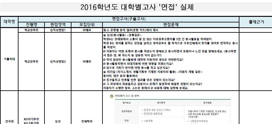 | |  | | | ▲ 출처=2017 수시 백전불태 확정편 | ■ 가톨릭대 의예과 면접 문제 인·적성 면접1: Ⅲ-2. 문항별 분석 결과(문항 카드)에서 제시 인·적성 면접2: ▣ 인성(봉사활동) <공통질문> 학생 A는 장애원에서 소통이 잘 안 되는 다운증후군 환자를 5년 간 돌보며 봉사활동을 해왔다. 학생 B는 영어를 잘하는 장점을 살리고 영어공부도 할 목적으로 구호단체에서 편지를 영어로 번역하는 봉사를 하였다. * 지원자는 어떤 유형의 봉사를 하였는지 말해보고 봉사하면서 보람이나 느낀 점을 말해 보세요. (봉사하면서 힘든 점, 왜 하는지 등 갈등한 적이 없는지요?) * 하지 않았던 봉사활동에 대하여 지원자의 생각은 어떠한지요? * 봉사활동이 의대 지원에 어떤 영향을 끼쳤는지요? * 앞으로 기회가 된다면 어떤 봉사를 하고 싶은지요? ▣ 리더십 (자기소개서, 생활기록부 기재된 지원자의 활동) <지원자 개별 질문> * 동아리, 캠프 등의 활동에서 친구들과 만족할 만한 결과를 얻은 경험이 있는지요? * 그 과정에서 회원들과 갈등이나 문제가 발생하여 해결한 경험이 있는지요? * 지원자가 수행한 발표, 소논문의 내용을 설명해 보세요. |