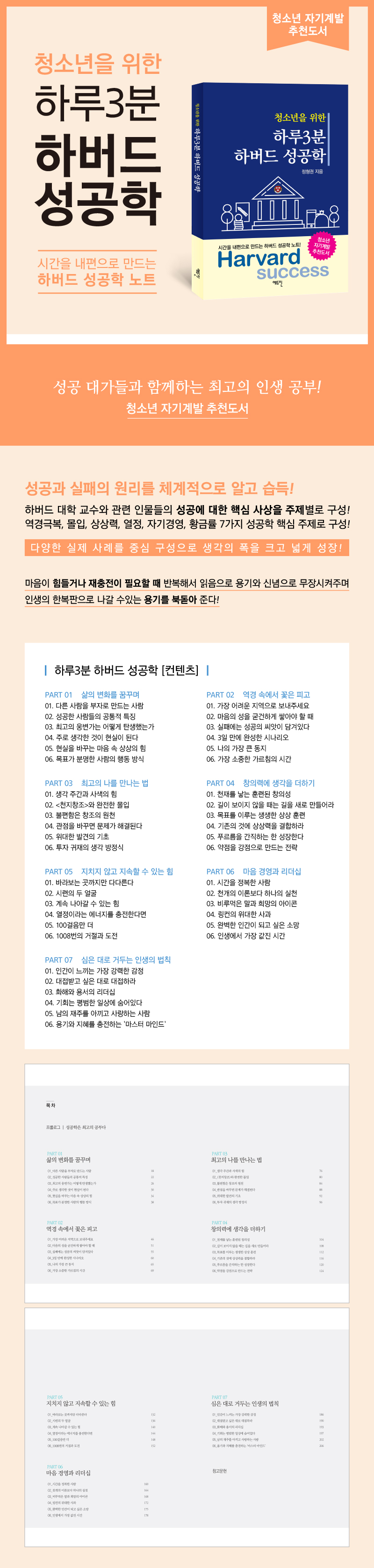 '청소년을 위한 하루 3분 하버드 성공학'은 온·오프라인 서점과 본사 쇼핑몰(www.365com.co.kr)을 통해 구입할 수 있다. 기타 문의는 전화 1522-1797로 하면 된다.