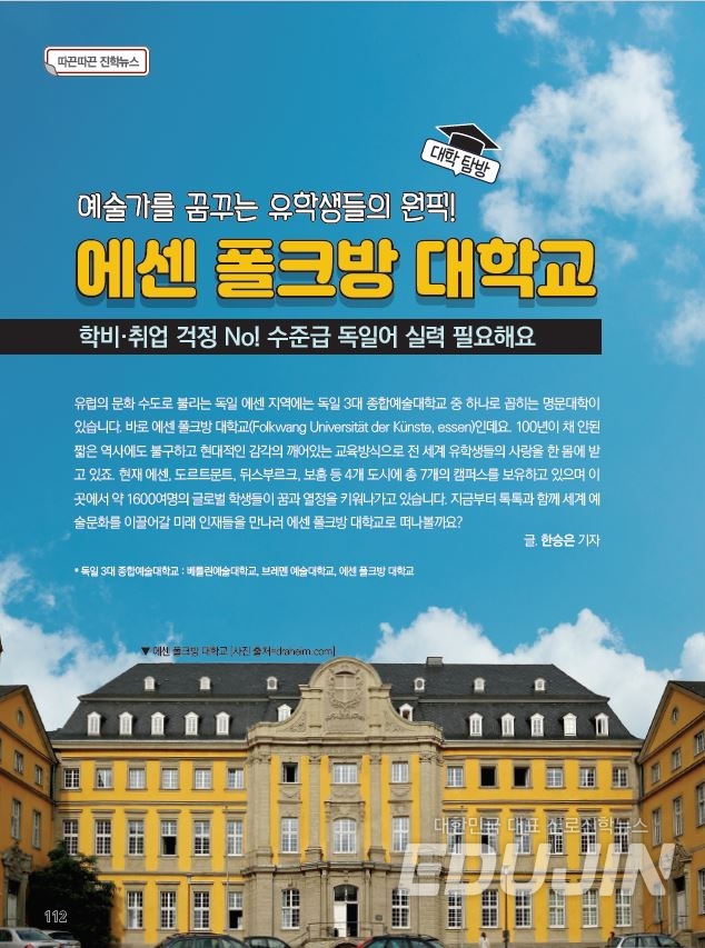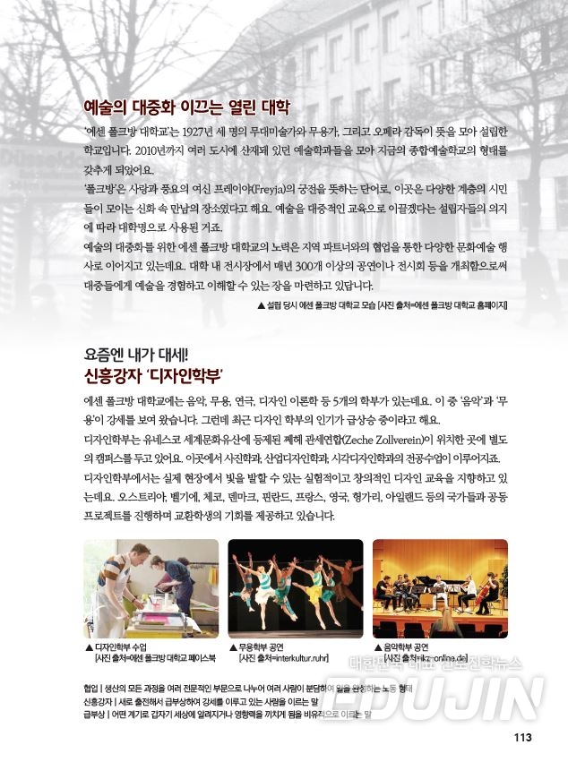 유럽의 문화 수도로 불리는 독일 에센 지역에는 독일 3대 종합예술대학교 중 하나로 꼽히는 명문대학이 있습니다. 바로 에센 폴크방 대학교(Folkwang Universität der Künste, essen)인데요. 100년이 채 안된 짧은 역사에도 불구하고 현대적인 감각의 깨어있는 교육방식으로 전 세계 유학생들의 사랑을 한 몸에 받고 있죠.