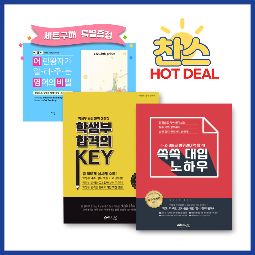 2023 고1·2·3이라면 누구나 읽어야 할 대입 필독서 세트인 「쏙쏙 대입 노하우」와 「학생부 합격의 KEY」를 구매하면 「어린왕자가 알려주는 영어의 비밀」을 특별 증정하는 이벤트가 진행된다. 현재 10% 할인가인 74,400원에 판매하고 있으며 배송비는 무료이다.