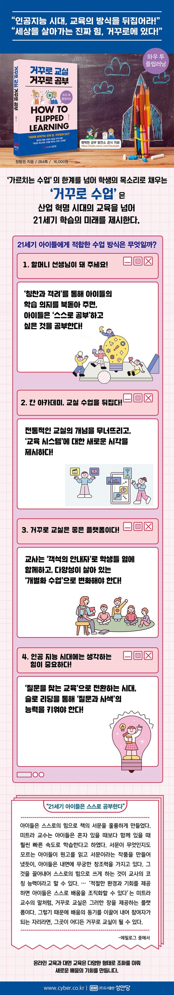 저자는 거꾸로 교실의 탄생에서부터 거꾸로 교실에 담긴 뜻, 그리고 구체적인 활동 등을 상세히 살펴보며, 그동안 현장에서 검증되고 효과를 본 방법들의 공통점을 모아 하나로 정리하는 데 주력하였다. 거꾸로 교실과 함께 ‘배움을 스스로 조직하는 아이들(수가타 미트라, 인도)’, ‘세상에서 가장 큰 학교, 칸 아카데미(살만 칸, 미국)’, 일본에서 시도되어 기적의 교실로 불렸던 ‘슬로 리딩(하시모토, 일본)’, 100% 온라인 수업으로 진행되는 스탠포드 온라인 고등학교나 미네르바 대학 등 다양한 교육과 학습 모델들을 살펴보면서 21세기의 아이들에게 적합한 지도방식이 뭔지를 끊임없이 묻고 또 그 대안을 찾으려 노력하였다. 특히 새로운 교육과 학습의 모델은 학생과 교사, 학생과 학생 간의 쌍방향 소통 모델이며, 교사의 역할이 단순히 지식을 전달하는 것이 아니라 조력자나 코치의 개념에 더 가까워져야 한다고 말한다.