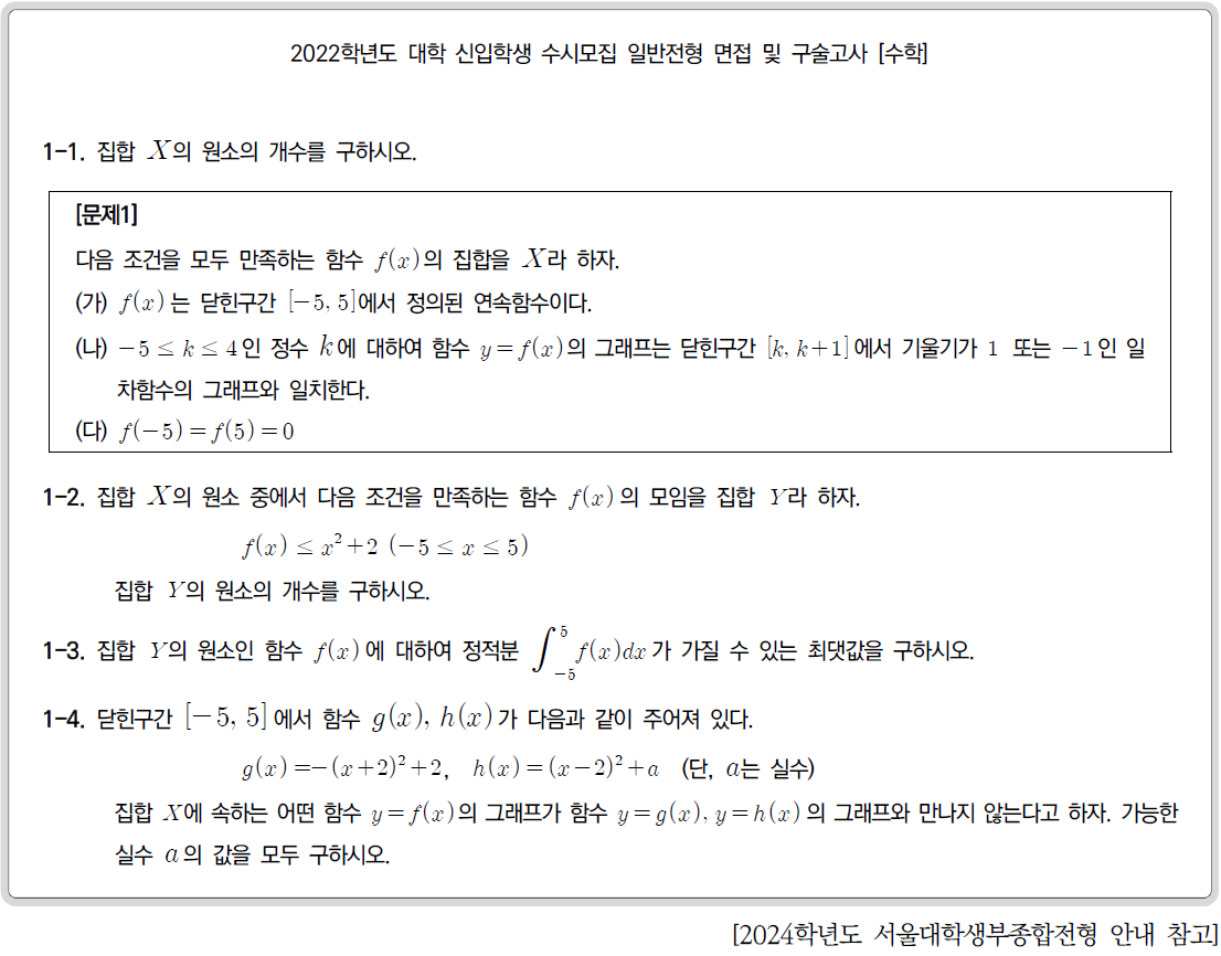 제시된 주제에 대한 면접 대상자의 분석 능력, 추론 능력, 관점, 가치관 등을 평가한다. 주로 학업 능력과 전공적합성을 평가하는 문제로 구성되며, 교과 내용을 적용해 문제를 해결하는 과정을 평가하는데 중점을 둔다.