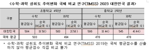한국 초4 학생들의 수학 평균 점수는 594점으로, 58개국 중 싱가포르, 대만에 이어 3위를 차지했다. 과학은 583점으로, 싱가포르 다음으로 2위에 해당했다. 이는 국제 평균(수학 503점, 과학 494점)을 훌쩍 뛰어넘는 수준으로, 직전 조사 때와 순위가 동일하다.