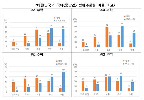 중2 '수월 수준' 학생 비율은 수학 40%, 과학 18%로 국제 중앙값(수학 7%, 과학 6%)을 웃돌았다. 이에 반해 '기초 수준 이하' 학생 비율은 수학이 12%, 과학이 20%로 나타나 국제 중앙값(수학 45%, 과학 44%)의 반토막도 채 되지 않았다.