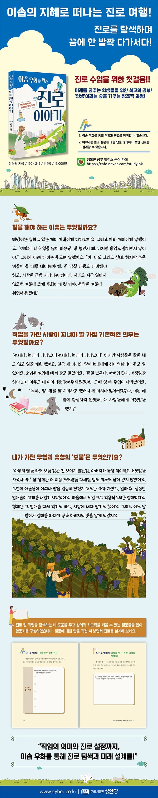 또한 유명한 이솝 우화를 읽으면서 ‘일을 해야 하는 이유가 무엇인지, 일은 나에게 어떤 의미가 있는지, 재능과 노력 중 무엇이 중요한지, 직업을 가진 사람이 지녀야 할 기본적인 의무는 무엇인지’ 등 진로를 탐색하고 미래를 설계할 수 있도록 정리하였다.